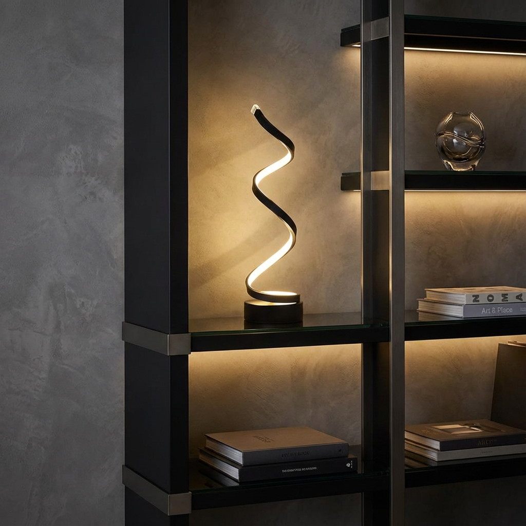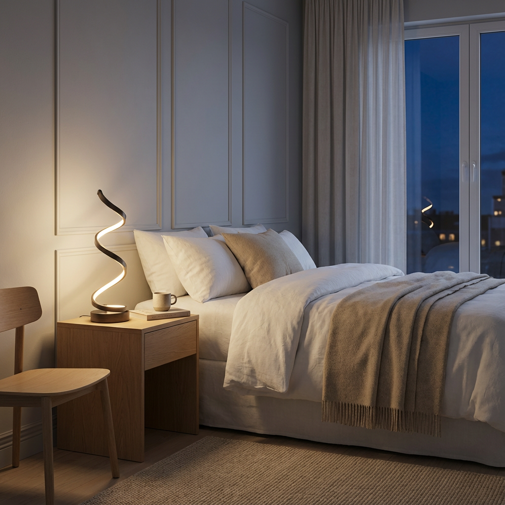 Den skulpturala siluetten ger rummet en elegant karaktär, medan det mjuka, varma ljuset skapar en inbjudande atmosfär – perfekt för nattduksbordet, skrivbordet eller vardagsrummets sidobord.